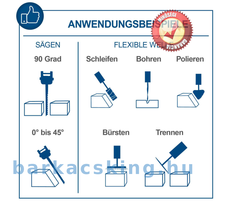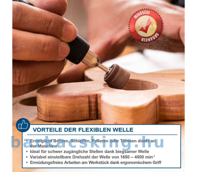 - Kiegészítő flexibilis tengellyel és fúrótokmánnyal vágáshoz, csiszoláshoz és polírozáshoz