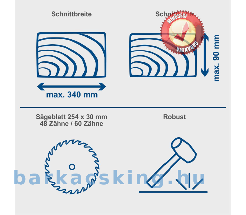 A mellékelt 48 fogú keményfém fűrészlap különösen pontos és tiszta hossz- és keresztvágásokhoz készült tömör fában. Egy második, 60 fogú keményfém fűrészlap is hozzátartozik. Két fűrészlap átmérője 254 mm.