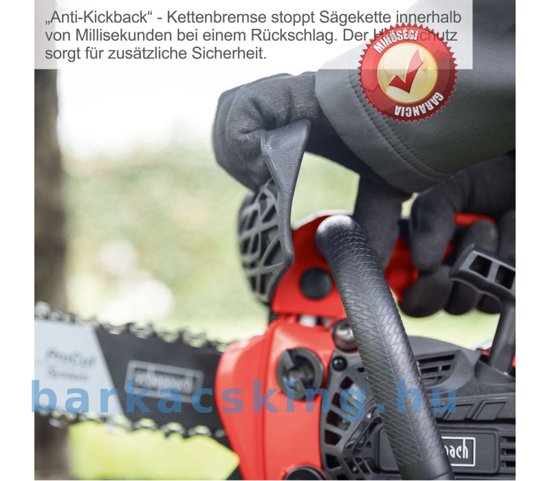 - A láncfék visszarúgás esetén néhány milliszekundumon belül leállítja a láncot