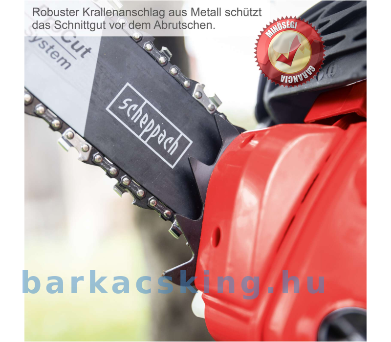 A Scheppach PCS26 benzinmotoros faápoló fűrész egy hatékony eszköz faápoláshoz, gallyazáshoz és lombkorona eltávolításához. Az erős 0,95 LE / 0,7 kW-os 2 ütemű benzinmotor és kiváló minőségű 25,4 cm-es ProCut vezetősín optimális vágási eredményt biztosít. A biztonságos működést a kézvédő és a láncfék lehetővé teszi, hogy ez visszarúgásodperceken belül leállítja a fűrészt.