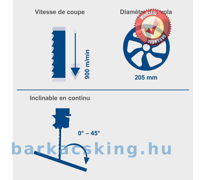 A gép alapja az erős indukciós motor, acélváz és az öntvényből készült 0°- 45°-ig dönthető és 380-520 mm-ig szélesíthető erős munkaasztal.