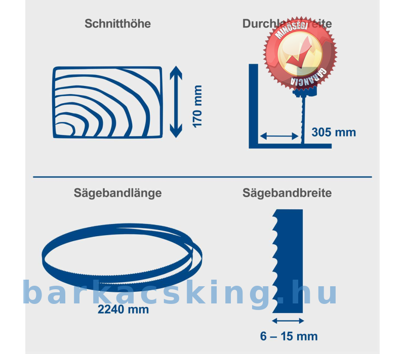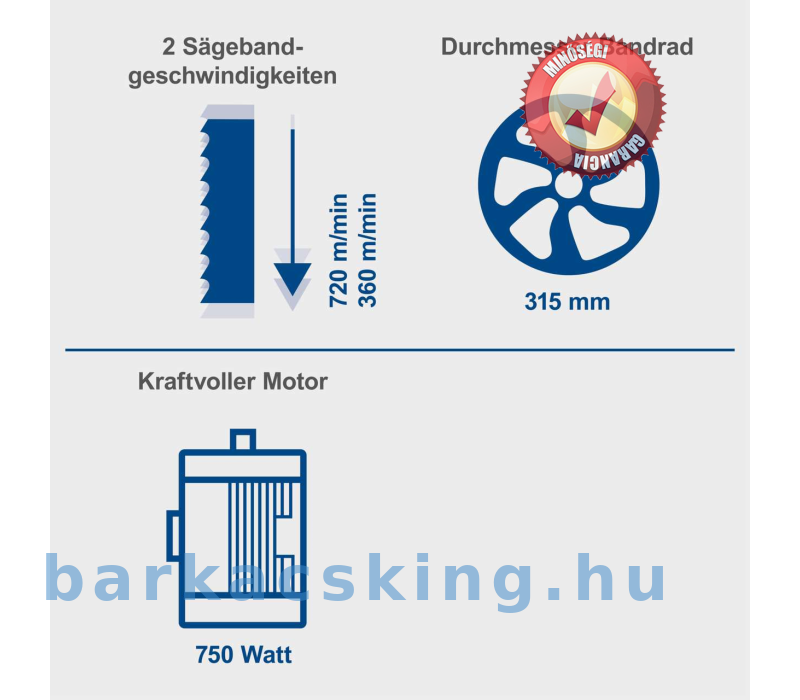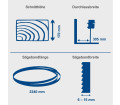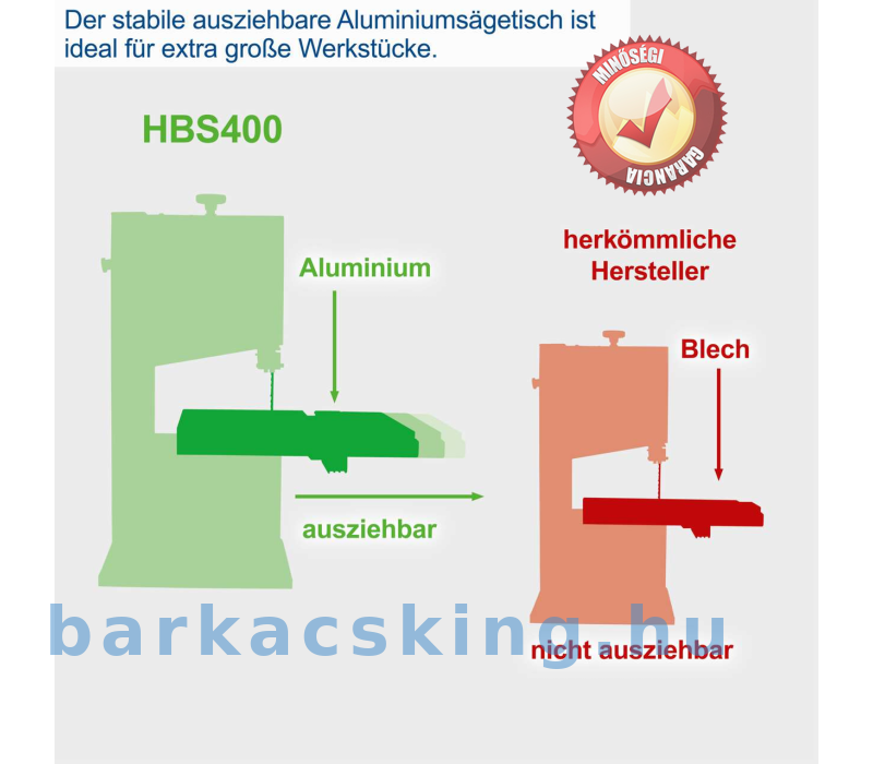 A fűrészlap kör alakúra van hegesztve, ami 170 mm-es vágási magasságot és a fűrészlap sima futását teszi lehetővé. A fűrészlap felül és alul egy precíz, golyóscsapágyas görgős vezetőn fut. 6-15 mm mélységével a fűrészlap olyan vékony, hogy a fűrészelés során csak kis mennyiségű anyag vész el – az ívek, sarkok és ívek fűrészelése sem jelent problémát. A HBS400 minden kereskedelmi forgalomban kapható, 2240 mm-es, legfeljebb 15 mm széles fűrészlappal használható.