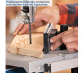 A munkadarabot a stabil munkaasztalon keresztül adagolják a fűrészlaphoz. Két munkadarab-ütköző biztosítja az optimális pozicionálást és az ujjak védelmét. A hosszütköző, a nézőüveggel és a gyorsreteszelő mechanizmussal a fűrészlap bal és jobb oldalán is használható. A keresztvágó sablon segítségével egy adott szög hozható létre a ferde vágáshoz.