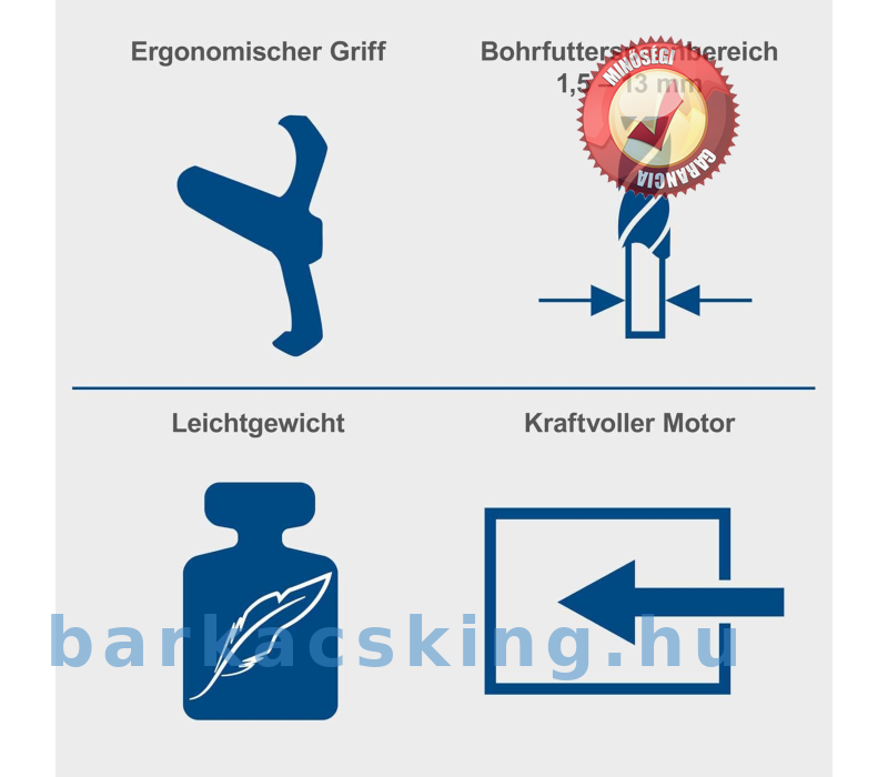 A tokmány befogási tartománya 1,5-13 mm a maximális fúráshoz 13 mm-es acélban és 40 mm-es fában