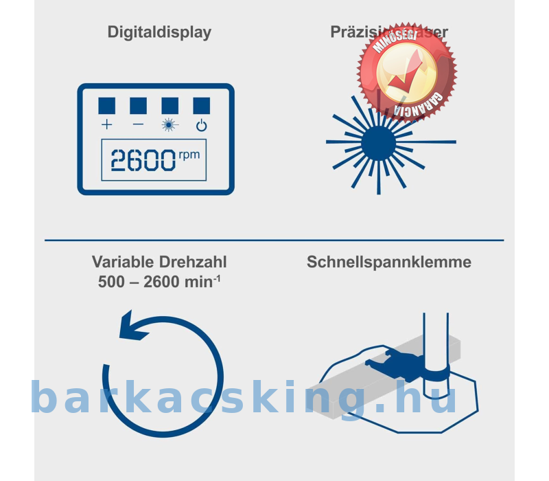 A fordulatszám pontos beállítás 500 - 2600 min-1 digitális kijelzőn keresztül