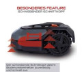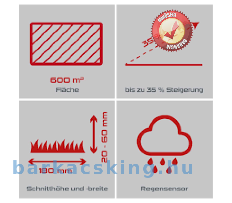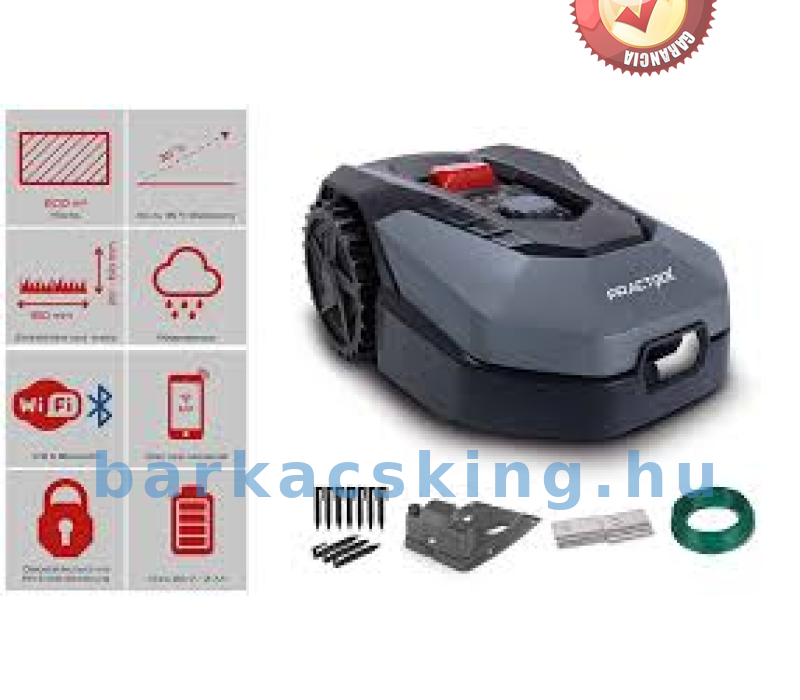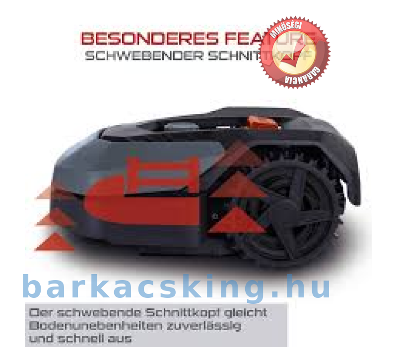 - Szállítási terjedelem: robotfűnyíró, gyorstöltő állomás, 130 m-es határolókábel, 180 földelőhorgony, 3 előre összeszerelt kés és 6 cserepenge