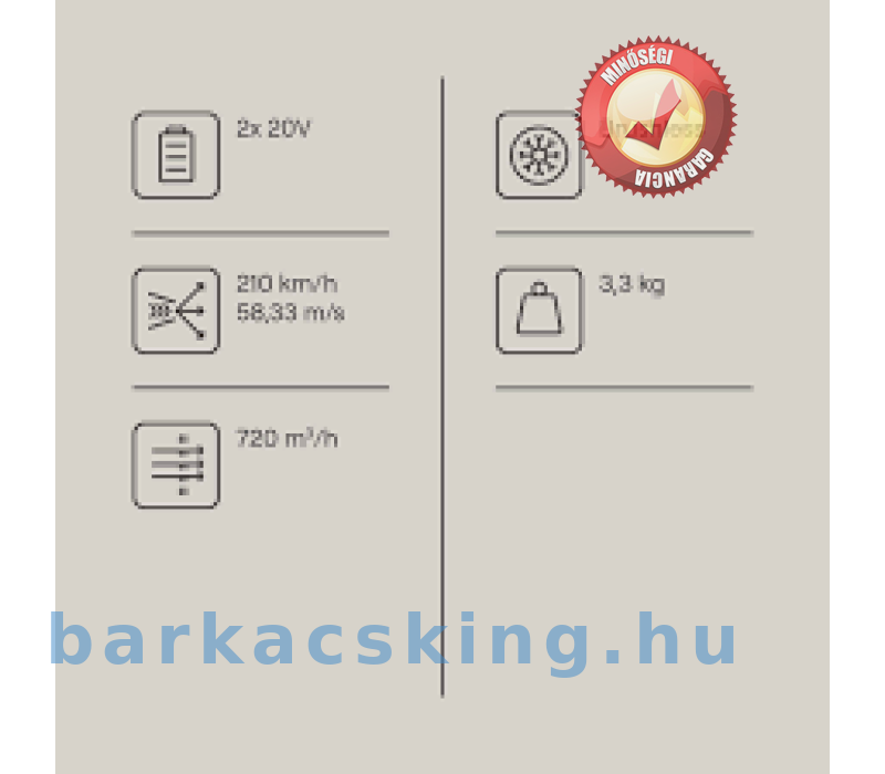 Erőteljes akkukkus lombfúvó 4 az 1-ben funkcióval: szívás, fúvó és aprító funkcióval, valamint beépített gyűjtőzsákkal Rugalmasság az egységes egységes rendszernek2 alacsony – egy akkumulátor a teljes gomag 20 V sorozathoz szükséges Karbantartást nemlő hossz kefe motor hosszú élettartam, kefe nélküli motoros hossz kefe motor hosszú élettartam, kefe nélküli motoros hossz kefe motor hosszú élettartamú, kefe nélküli motoros hosszabb motoros élettartam, kefe nélküli motoros hosszúságú motor élettartam, működéshez) Nagy légseb 210 km/h és légmennyiség 720 m3/h 45 literes gyűjtőzsák betekintő ablakkal a töltésszint szabályozásához A 10:1 mulcsozási arány a kerti hulladékot könnyen kezelhető talajtakaróvá csökkenti Szerszám nélküli átkapcsolási fújásról szóló szívás/aprítás üzemmódra és Nagy Ergonomikus munkavégzésre. könnyű kezelhetőség érdekében Ergonomikus markolat csúszásmentes puha markolatfelülettel Tartalmaz 2x 4Ah akkumulátort és 2x töltőt
