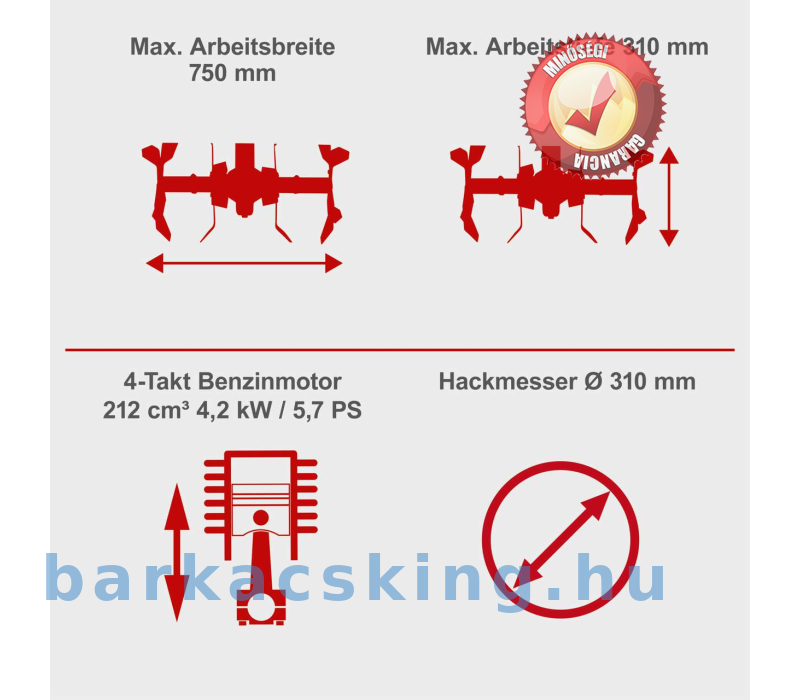 A 750 mm-es munkaszélesség garantált a gyors haladás. A 24, 315 mm-es penge legbiztosabb átmérőjű talajlazítást biztosít.