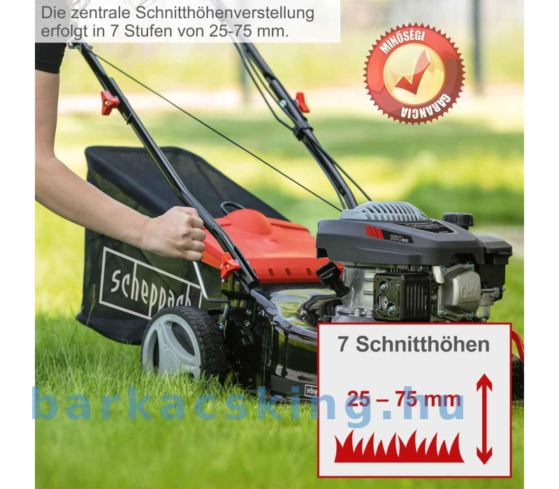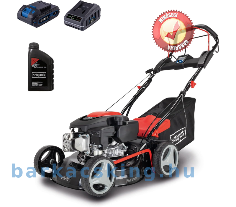 Scheppach Fűnyíró RM420AE | 5 az 1-ben 3,5 LE | Vágási szélesség 420 mm | 45 literes gyűjtőkosár | Vágási magasság állítás 25-75 mm | Tartalmazza az elektromos indítást, a kerékmeghajtást, a tisztító funkciót é.