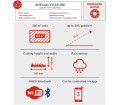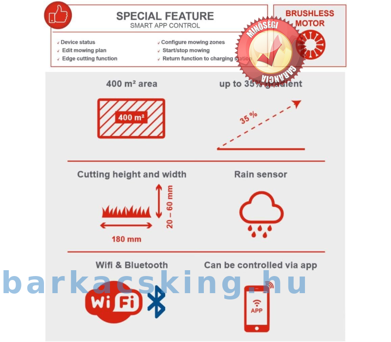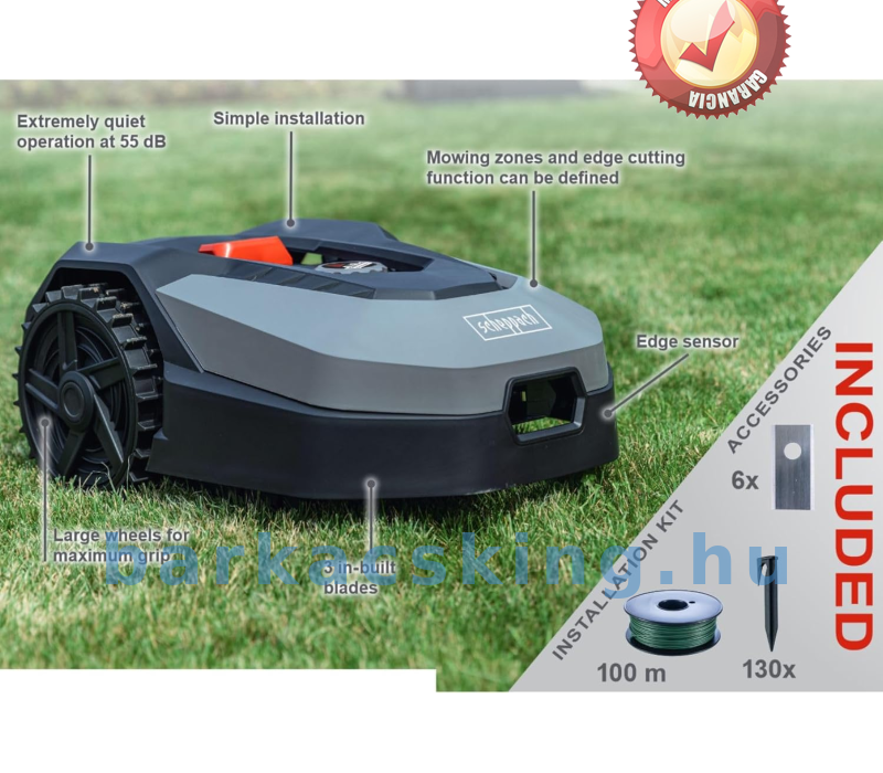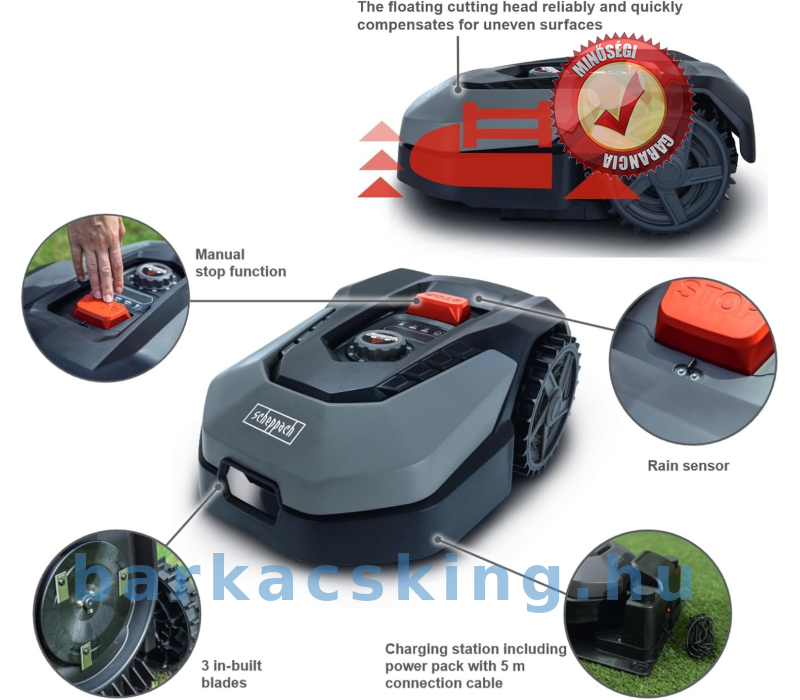 A beállított szenzorokkal megbízhatóan leállítja, ha gyerekek vagy a kertben lévő kis lábakkal érintkeznek vele, így megelőzi a sérüléseket. A modern applikációnak nagyon igény szerint állítható és programozható a pontos időre való működésre, suttogó halk,62 dB működési hangerejének, pedig szinte észre sem veszi.