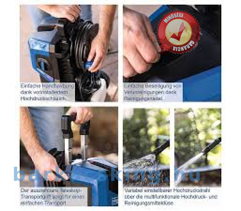 Felszereltség: 8 m magasnyomású tömlő, 0,8 l-es beépített mosószer tartály, szórópisztoly szórófejjel és hosszabbító szárral, turbó fúvóka, rotációs kör mosókefe, nyomás kijelző