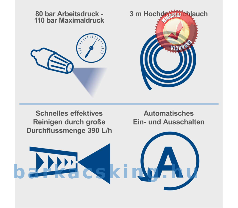 • Erőteljes 1400 W-os motor 110 bar maximális tisztítási nyomással és 80 bar üzemi nyomással