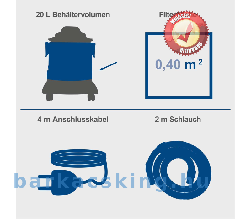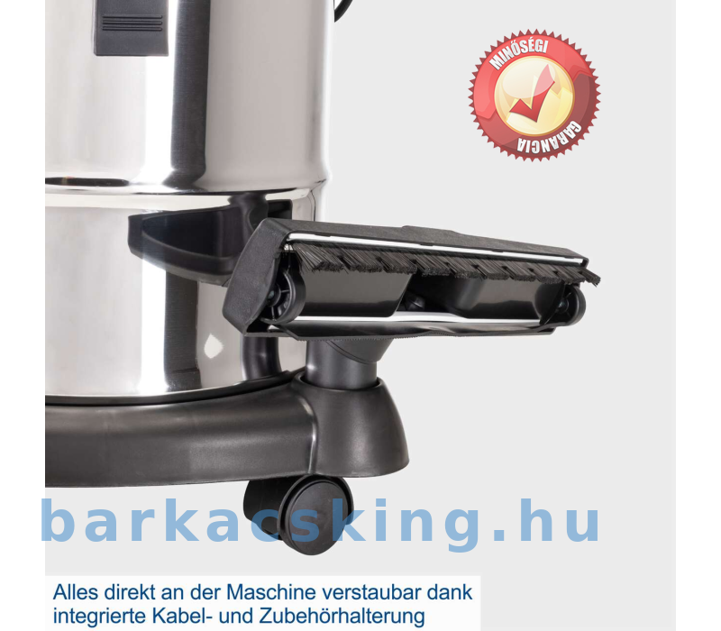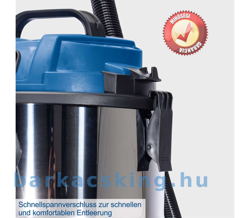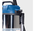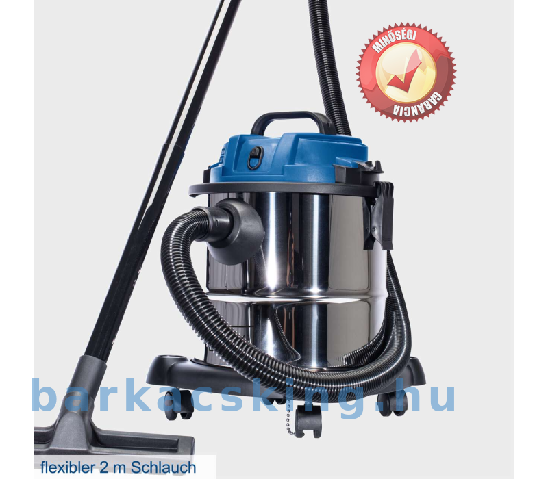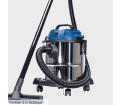 Akár nedves, akár száraz, durva szennyeződést vagy finom forgácsot, az NTS20 nedves-száraz porszívó mindent felszív. Ez a praktikus porszívó hordozófogantyúval és négy forgókerékkel is fel van szerelve – tökéletes a rugalmas használathoz, legyen szó műhelyről, ház körüli munkáról vagy autótisztításról. A 38 mm-es szívócső három részből áll, és helytakarékos tárolás érdekében szétszerelhető. A 2 méteres szívótömlővel együtt ez megfelelő munkasugarat biztosít. A simán futó kerekeknek tökéletesen használható a kis porszívó könnyen követi. A készletet egy réstisztító fej és egy nagy kombinált fej szőnyegekhez és kemény padlókhoz teszi teljessé. Ezáltal az NTS20 bármire felkészített. Egy nagy teljesítményű, 1200 wattos motor 20 kPa szívóteljesítményt biztosít. A rozsdamentes acél tartály 20 literes űrtartalmú. Száraz szennyeződés porszívózása esetén a felgyűlt törmelék egy papírzsákba gyűlik. A papír porzsáknak a tartály gyorsan és egyszerűen üríthető a szennyeződéssel való érintkezés nélkül. Nedves porszívózáshoz habszűrő tartozik hozzá. További funkcióként az NTS20 fúvónyílással rendelkezik a nehezen elérhető területek kifújásához. A kábelek és tartozékok helytakarékos módon közvetlenül a porszívóra rögzíthetők.