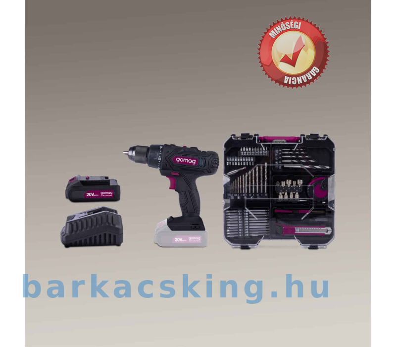 Mobil műhely fúróval és kiterjedt tartozékkészlettel a sokoldalú munkához a műhely kertben, építkezésen vagy mobil használatra Rugalmasság az egységes akkurendszernek a teljes egészében a teljes gomag 20 V sorozathoz Erőteljes motor 2 sebességes sebességváltóval és fokozatmentesen állítható számmal a munkavégzés maximálisan Automatikus orsózár – Spindle Lock N- Nagy0 az0. 1 nyomatékszintek Kiváló minőségű fúrótokmány gyorskioldó szerkezettel, 1,5-13 mm-es befogási tartom Fokozatmentesen változtatható fordulatszám, be/ki kapcsolóval állítható Ergonomikus kialakítás és könnyű kezelhetőség a puha markolatnak töltése kiváló A LED-es munka lámpa rossz fényviszonyok0 mellett is tökéletes megvilágítást biztosító LED Praktikus akku akkumulátor teljesv. technológiával önkisülés és memóriaeffektus nélkül Robusztus hordtáska mobil használatra és helytakarékossághoz Tartalma: 20 V / 2,0 Ah akkumulátor, 2,4 A töltő és 74 részes tartozékkészlet: 1x vágókés, 1x asztalos ceruza, 1x dugattyús mérő, 18 szalag fúvóka, 1x középső szalag lyukasztó, 1x középső fém lyuk4 fxó5 bit, 1x bittartó