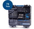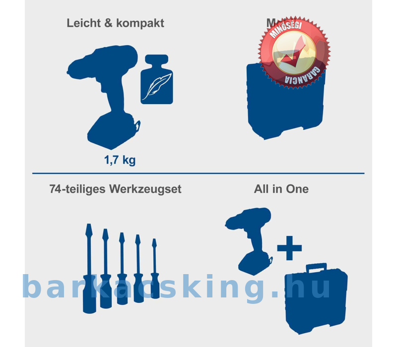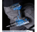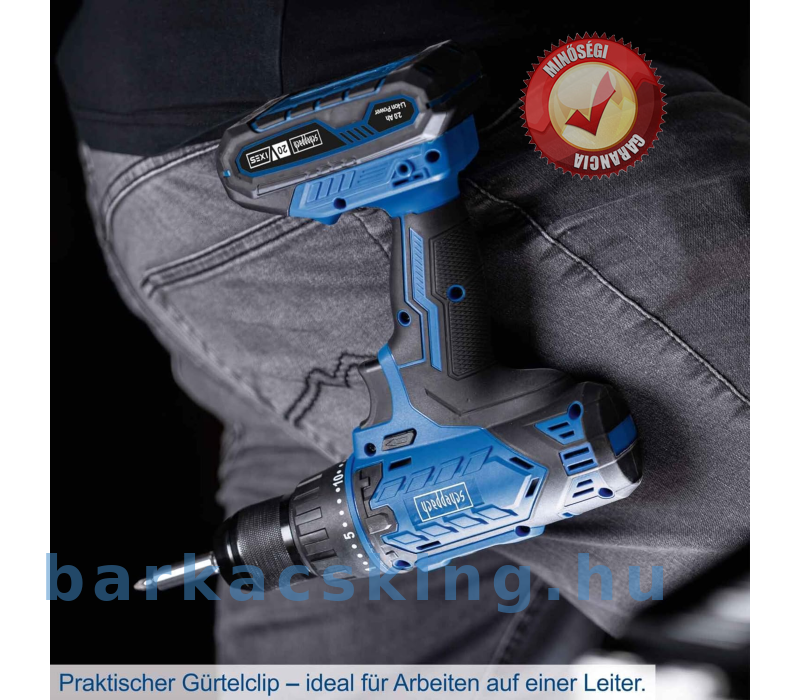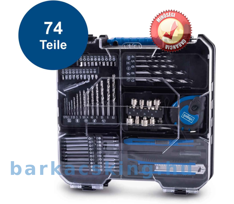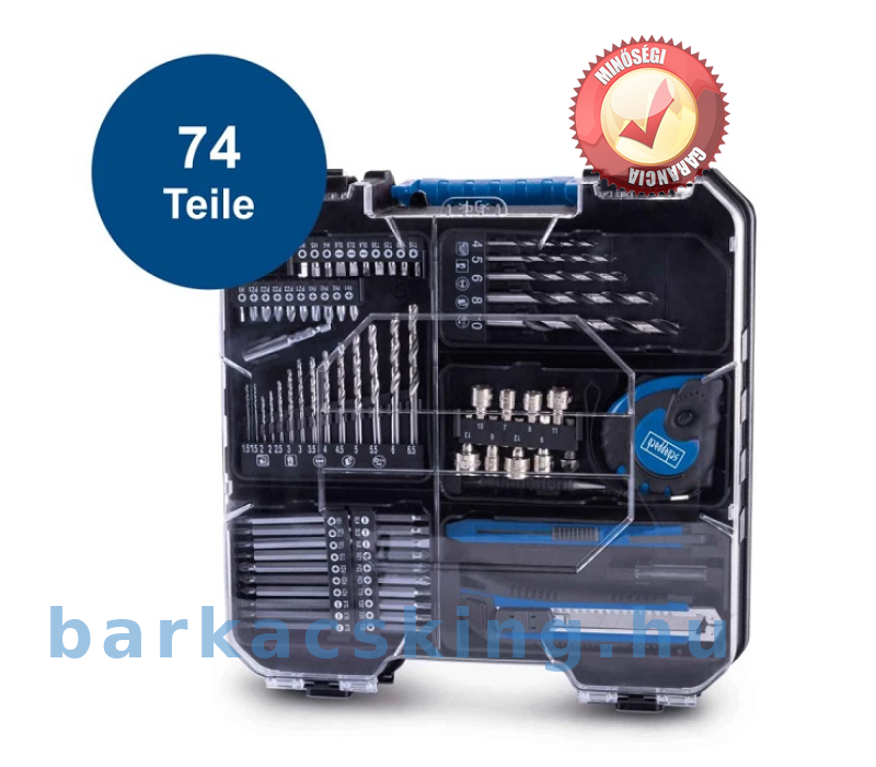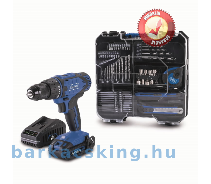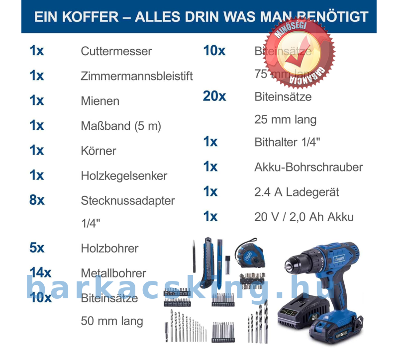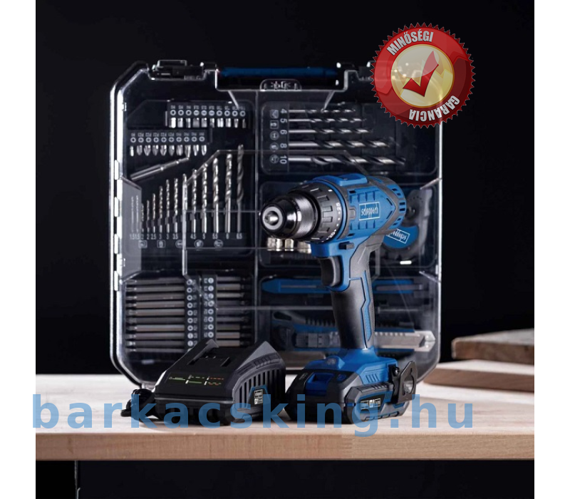 Tartalmaz 20 V/2,0 Ah akkumulátort, 2,4 A töltőt és 74 részes tartozékkészletet: 1 x vágó szalag kés, 1 x asztalos ceruza, x csészé, 1 x mérő, 1 x mérő süllyesztő, 8 x dugaszoló adapter 1/4 hüvelykes, 5 x fafúró, 14 x fémfúró, 10 x bitbetét 50 mm, 10 x bitbetét 7,5 mm, 20 mm, x bitbetét 25 mm, 1 x bit 1/4 hüvelyk