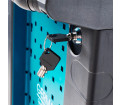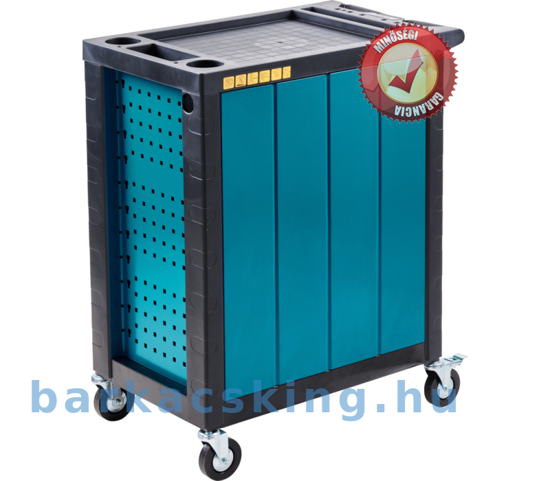 GWT11 műhelykocsival a szerszámai mindig kéznél vannak – egy 70 darabos készlet már benne van. A kompakt kocsi nagy munkafelületet kínál integrált rekeszekkel – tökéletes elektromos szerszámok és gyakran használt berendezések számára. Összesen hat zárható, golyóscsapágyas fiók simán kihúzható, és bőséges helyet biztosít a további tartozékoknak. Ezek közül kettő már meg van töltve, többek között csavarhúzókat, kalapácsokat, dugókulcsokat, irányváltós racsnit, bittartót és bitkészletet, villáskulcsokat és csillagkulcsokat, átfogó fogókészletet, feszültségvizsgálót és I-kulcsokat tartalmaznak. Minden szerszám robusztus króm-vanádium acélból készült, és némelyik gumírozott fogantyúval rendelkezik egy különösen kényelmes használat érdekében. Az oldalsó panelek lyuk táblákkal további tárolási lehetőségeket kínálnak – az Ön igényeihez igazítva. A négy könnyen gördülő keréknek, mely kettő reteszelő funkcióval rendelkezik, a kocsi könnyen manőverezhető és biztonságosan elhelyezhető. Az ergonomikus, puha markolatú fogantyúk kényelmes szállítást biztosítanak még egyenetlen felületen is. Ez a műhelykocsi akár 200 kg-ot is elbír, így ideális még a legnehezebb munkákhoz is. Akár hobbi felhasználóknak, akár szakembereknek szánják – ez a műhelykocsii a munkájukat.