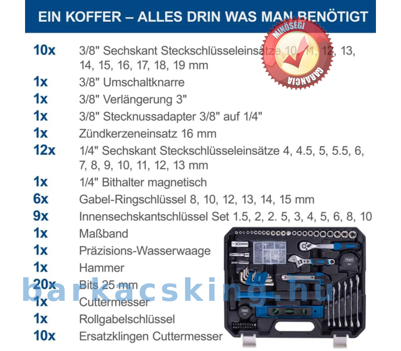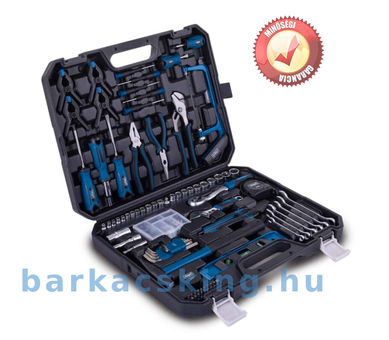 Összesen 169 szerszámot tartalmaz, beleértve különféle csavarhúzókat, különféle dugókulcsokat, fém fűrészt, kalapácsot és még sok mást. A praktikus racsnis csavarhúzó csuklós fogantyúval és racsnis funkcióval, jobb/bal kapcsolóval lehetővé teszi a hatékony csavarozást még nehezen hozzáférhető helyeken is.