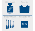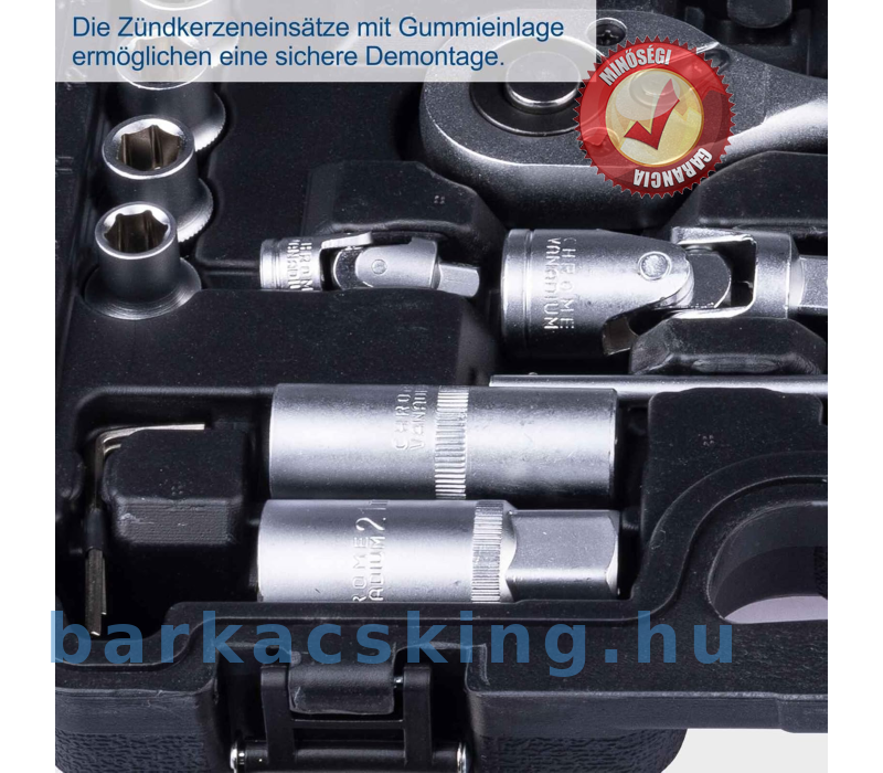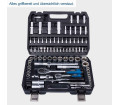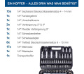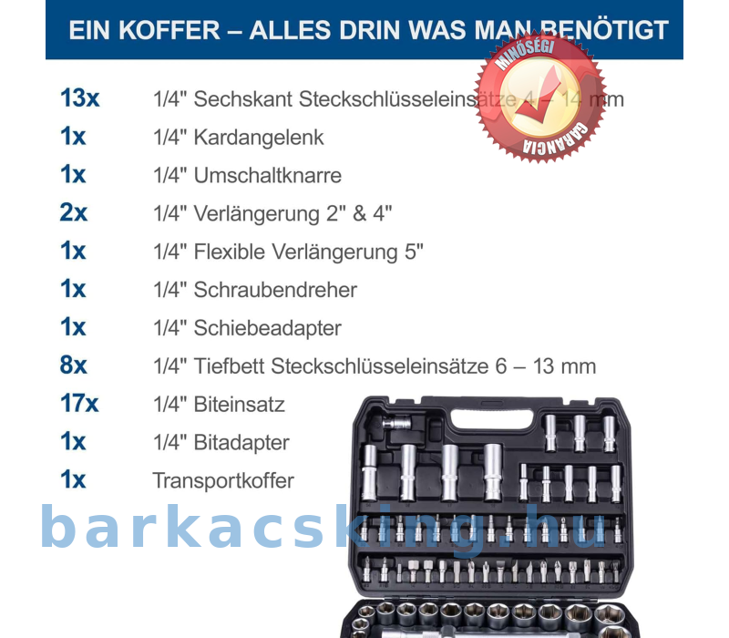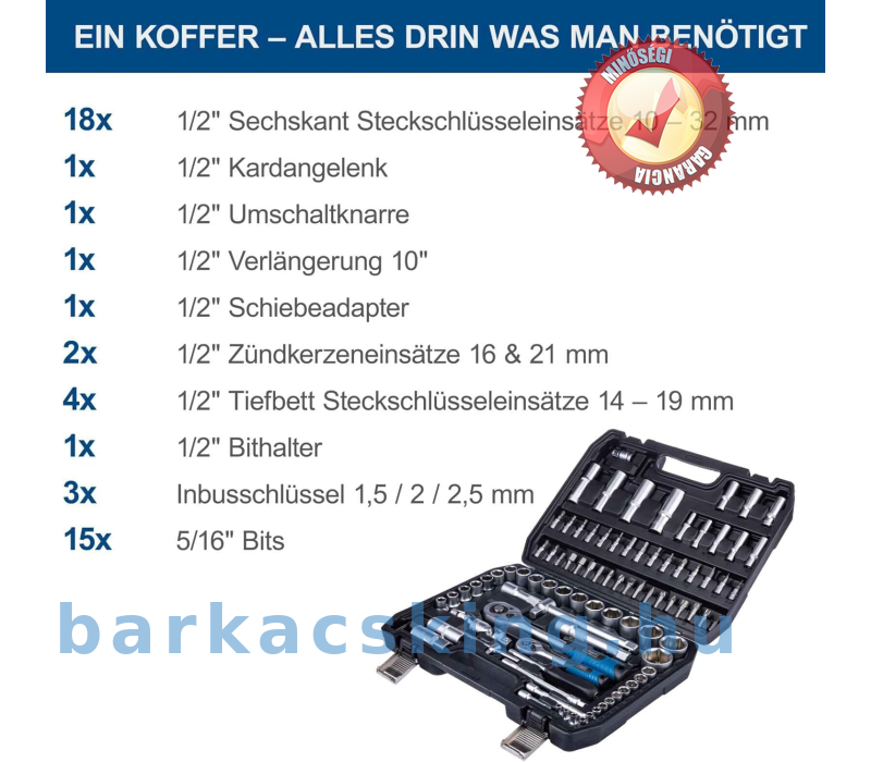 18 x 1/2 hüvelykes hatlapfejű csavarkulcs betétek 10 mm - 32 mm / 1 x 1/2 hüvelykes kardáncsukló / 1 x 1/2 hüvelykes megfordítható racsnis / 1 × 1/2 hüvelykes hosszabbító 10 hüvelyk / 1 × 1/2 hüvelyk csúszó adapter / 2 x 1/2 hüvelykes gyújtógyertya betét 16 és 21 mm / 4 x 1/2 hüvelykes mély ágygyertya. 15, 17, 19 mm / 1 x 1/2 hüvelykes bittartó / 15 x 5/16 hüvelykes bit / 13 x 1/4 hüvelykes hatlapfejű csavarkulcs betétek 4 mm - 14 mm / 17 x 1/4 hüvelykes bitbetétek / 1 x 1/4 hüvelykes kardáncsukló / 1 × 1/4 hüvelykes megfordítható racsnis / 2 × 1/4 hüvelykes hosszabbító 2 hüvelyk. & 4" / 1 x 1/4 hüvelykes csúszó adapter / 1 × 1/4 hüvelykes csavarhúzó / 1 × 1/4 hüvelykes bit adapter / 8 × 1/4 hüvelykes mély ágykulcs 6, 7, 8, 9, 10 , 11, 12, 13 mm / 1 x 1/4 hüvelykes rugalmas hosszabbító 5 hüvelyk / 3 x imbuszkulcs 1,5, 2, 2,5 mm / 1 x szállítótáska