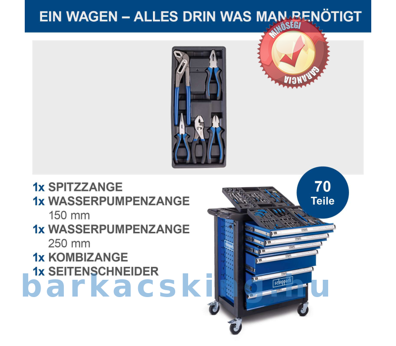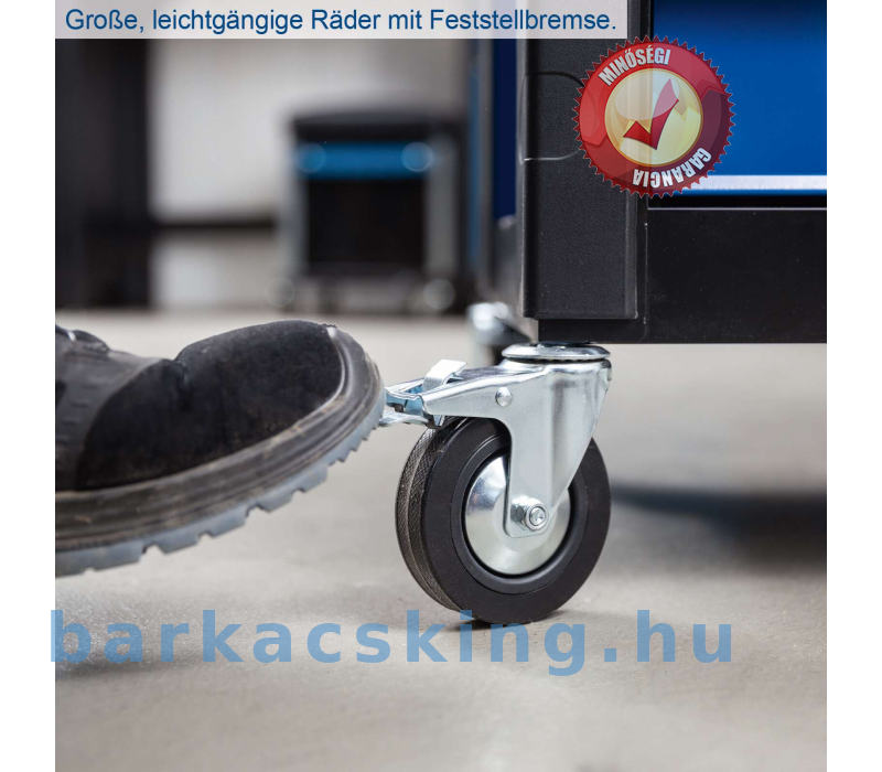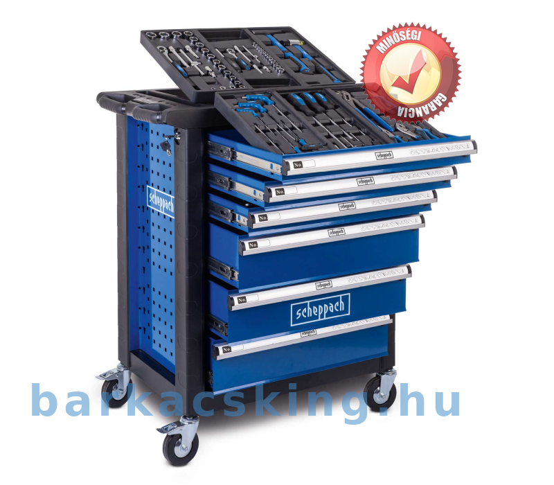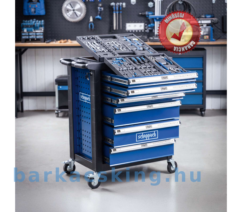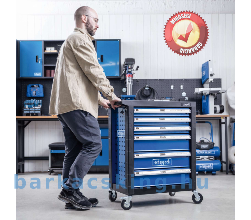A Scheppach TW1150 műhelykocsival mindig kéznél van egy megfelelő szerszám. Ez a praktikus műhelykocsi egy átfogó, 70 darabos szerszámkészlettel van felszerelve, maximálisan 200 kg-os terhelés bír el. A mellékelt szerszámok kiváló minőségű króm- [1] vanádium acélból készültek. A nagyméretű, integrált rekeszekkel ellátott tárolóhely bőséges helyet kínál a szerszámok és gépek számára. A hat golyóscsapágyas, könnyen kihúzható fiók közül három szerszámokkal van tele. Négy könnyen gördülő kerék és ergonomikus, puha markolatú fogantyú lehetővé teszi a könnyű szállítást a kívánt helyre. A fiókok a biztonságos tárolás érdekében zárhatók is.